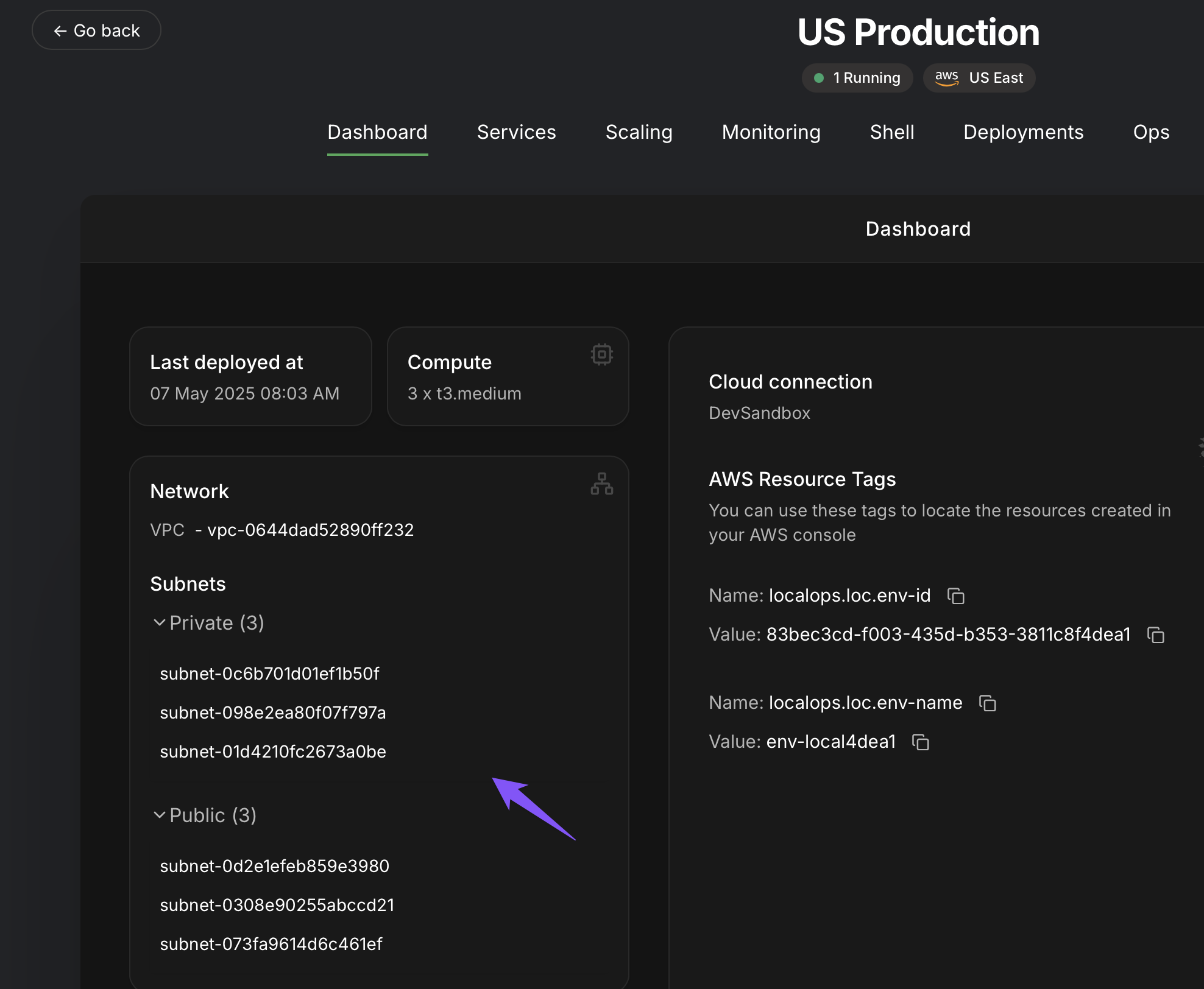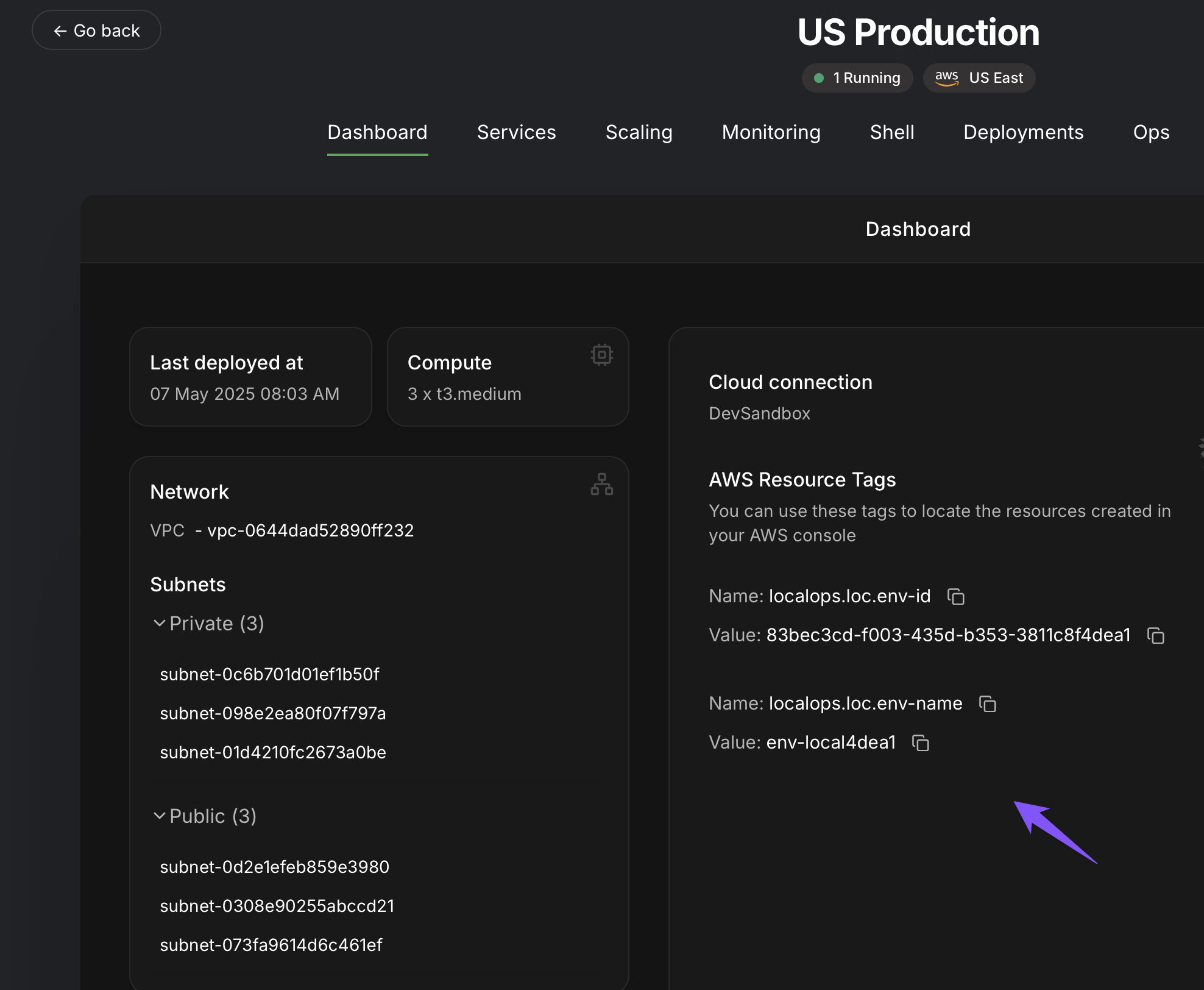 To do this, we expose IDs of the above entities within LocalOps environment dashboard: